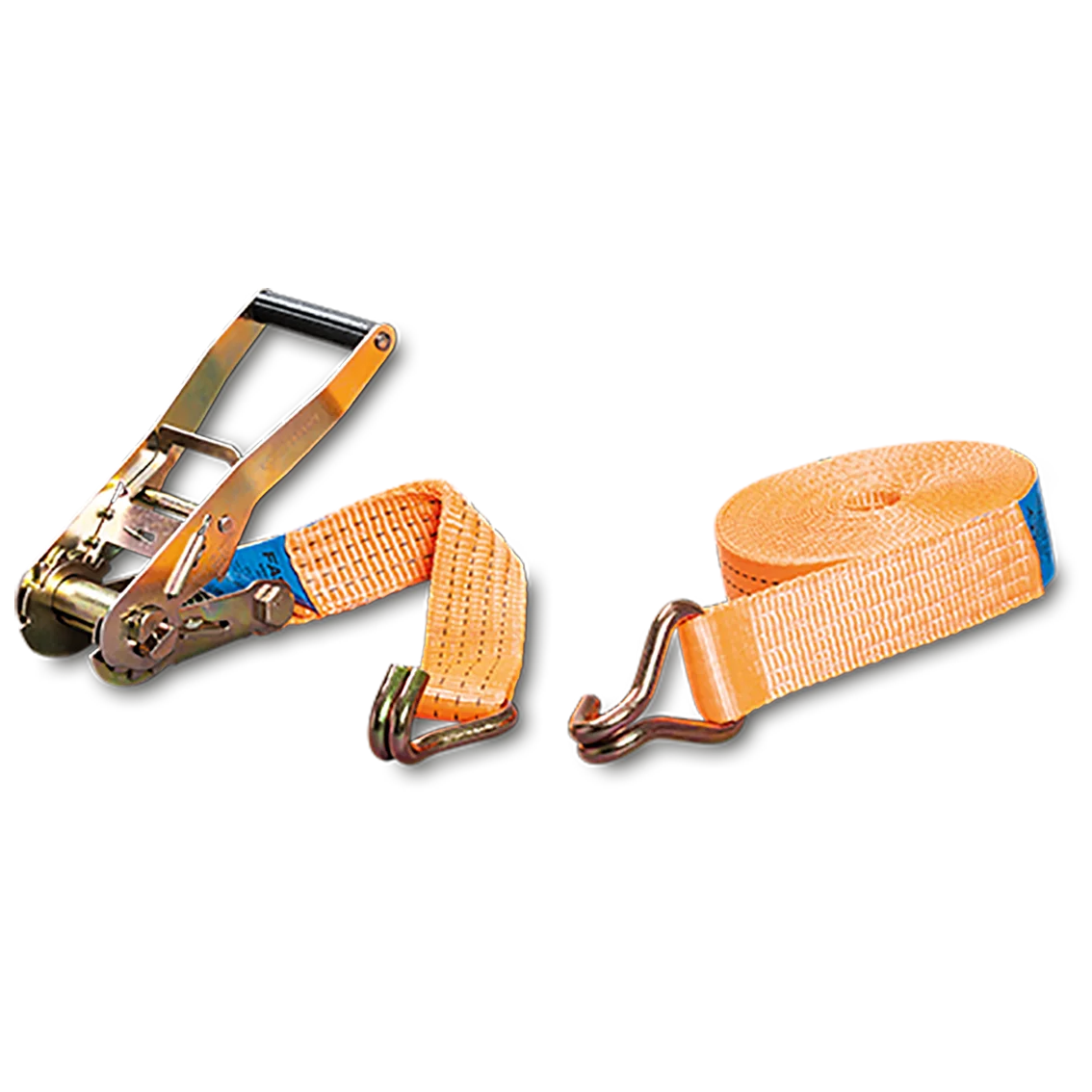 Tvådelat kraftigt spännband med lastspännare för mycket tynga surrningar tillverkad enligt standard EN 12195-2.
