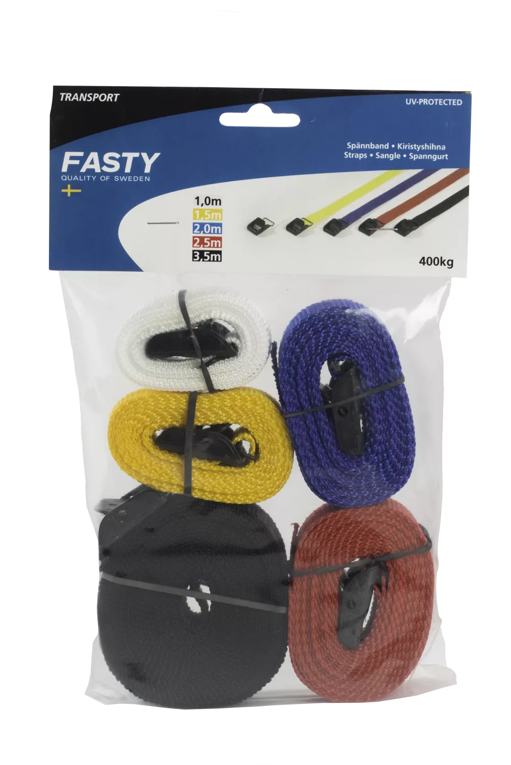 Spännremmar i flera färger och längder förpackade i plastpåse.